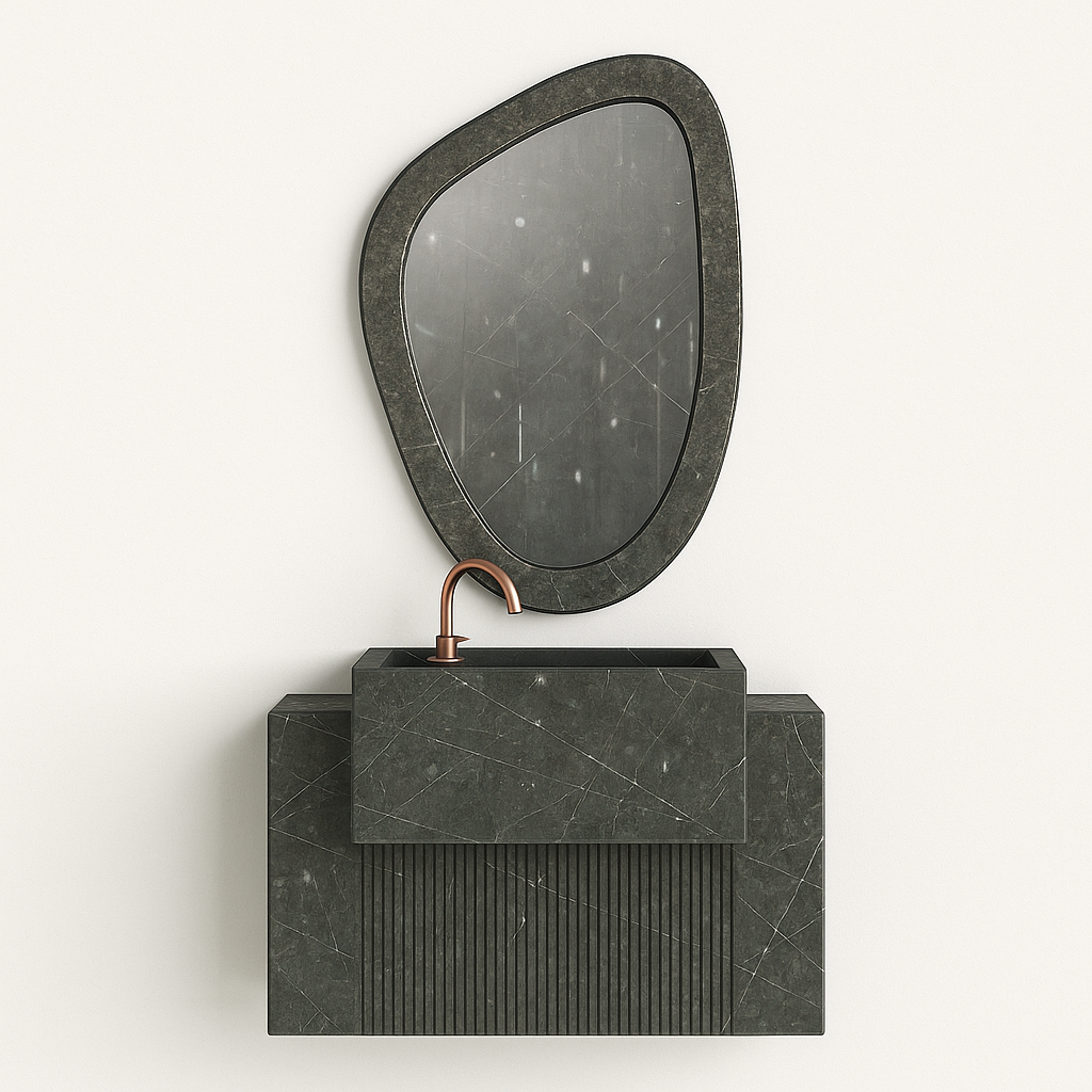 A striking wall-mounted porcelain counter with a grooved textured base and integrated LED mirror. The perfect blend of sophistication and function for designer bathrooms.